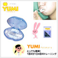仕様 品名:リップトレーナーユーミー 用途:唇トレーニング器具 材質:本体・板バネ部分:ポリエステル、エラストマー 分類:健康雑貨 付属品:簡易口唇力計/ケース/砂時計/プラスチック板バネ2本 サイズ:7.3cm×5.5cm×2cm かたさ:ブルー/ふつう 製造元:株式会社デンタル・ユーミー/日本|商品詳細はこちら リップトレーナー ユーミー| ※商品パッケージ等の仕様が変わることがございます 使用方法・ご注意事項 ■まずは唇を閉じられるようにがんばりましょう!リップトレーナーのトレーニングは、くちびるをパクパクと開閉せず、閉じ続けてください。閉じられるようになってからロープを引っ張るトレーニングを始めてください。 ※唇ではさんでください。歯で噛まないようにしましょう。 ・女性、アトピーの方はピンク(やわらかめ)をお使い下さい。 ・男性、ピンクを使って慣れてきた方はブルー(ふつう)をお使いください。 寝るときには使用しないで下さい。雑菌、カビが発生しないよう十分洗浄し、清潔に保ってください。